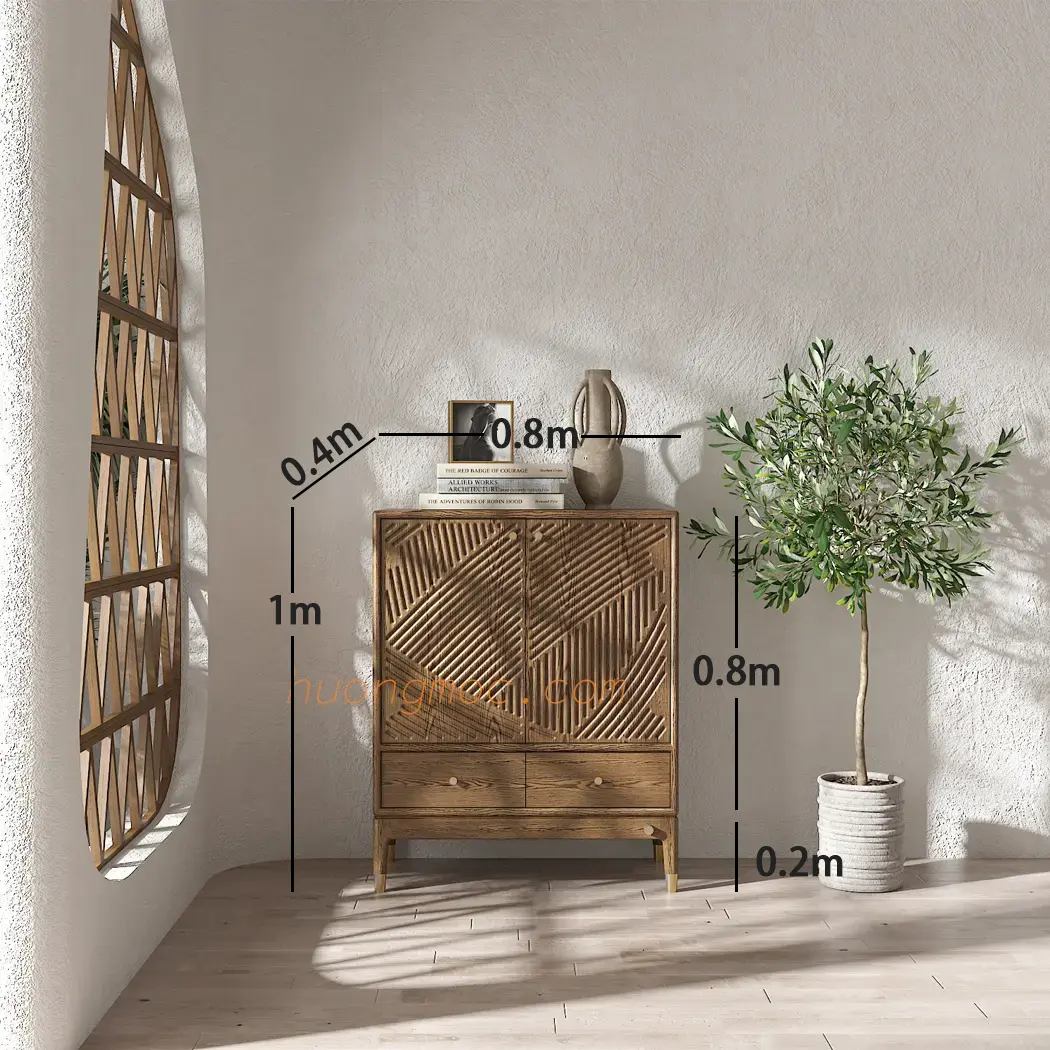 – Thân tủ + cánh + mặt hộc: Gỗ cao su ghép dầy 21mm, tẩm sấy hút chân không phủ venneer Sồi tự nhiên.